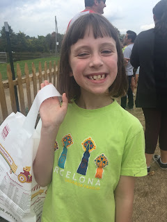 - Trooper: Frances really rose to the occasion. We went to a very popular apple orchard. It was a terrible decision. Parking took fifteen minutes. Getting to the farm proper took another fifteen minutes. By the time we'd paid to enter, we were told that the donut shop would be closing soon and the donut line would soon be horrendous. We hurried ourselves to the donut line, along with everyone else. A woman near Frances was frightened by a bug (in all fairness, it was huge). She jumped and she bumped into the concrete block corral that was steering us towards to donuts. A concrete block fell and scraped Frances, almost from knee to ankle. Frances did very nicely, considering her leg was bleeding and about fifty people were watching her be miserable. And there was a war re-enactment going on down the road, so there were lots of explosions going off as well. Then someone else bumped the concrete block corral and it fell on Chandler. I do wish I were making this up. In the end, Frances pulled it together, we got our donuts (and some ice cream, courtesy of the farm) and managed to pick apples. What a mess. Next fall, we will drive to a less popular farm and Frances won't have to be such a trooper.